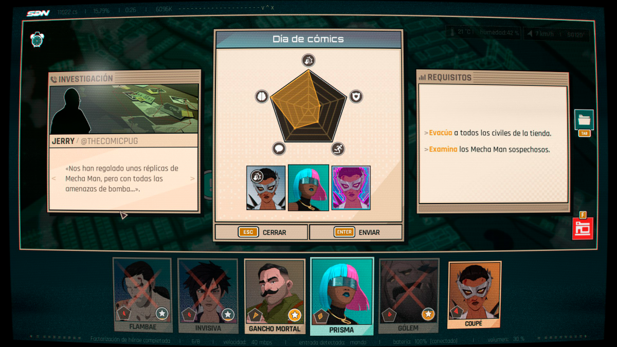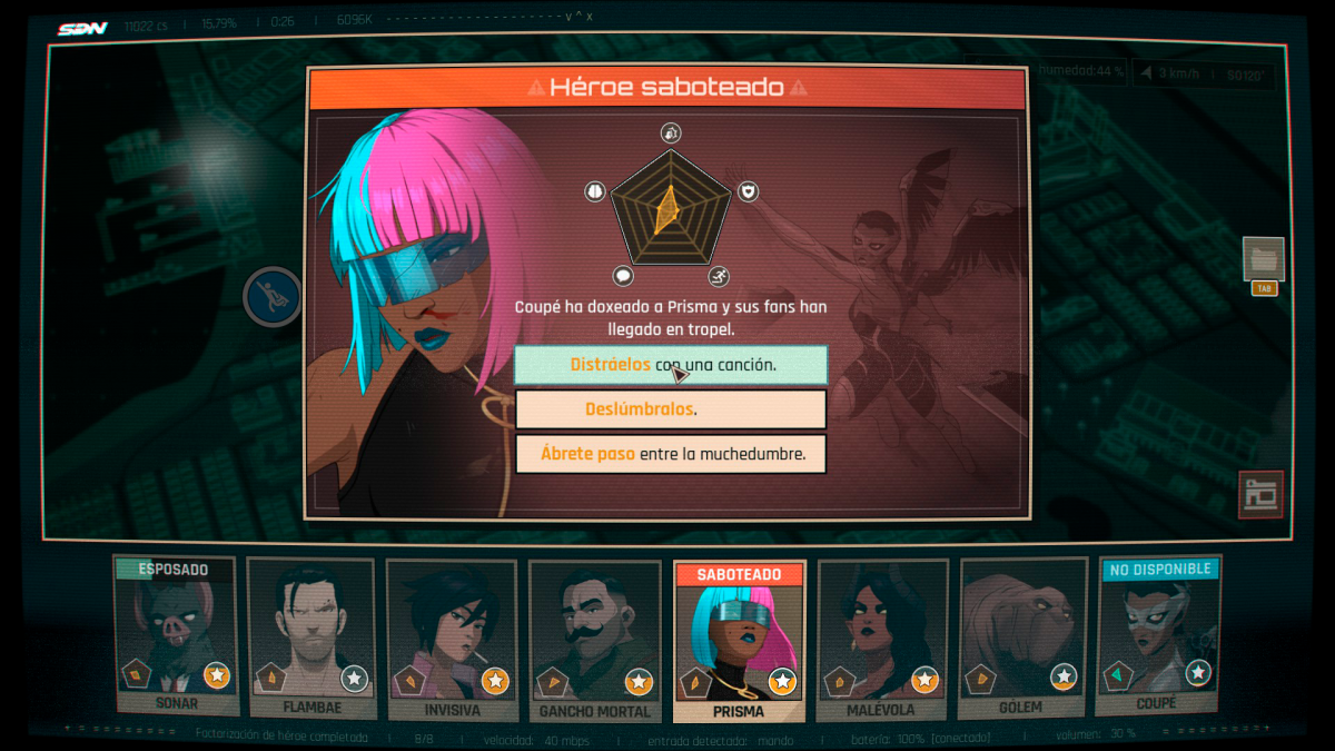 La partida, sea cual sea el rumbo que vayamos construyendo con nuestras decisiones, dependerá también del grado de implicación con la historia que tengamos. De todas formas considero que AdHoc ha hecho un buen trabajo, tanto de escritura como el del elenco —brillante, estelar— que da voz a sus personajes, a la hora de entregarnos los elementos necesarios para que la inmersión se antoje natural. Me cuesta imaginar una partida distinta a la que viví, en la que Prisma se convierte en esa heroína catalizadora que mejora a sus compañeros, Gólem solventa todo problema con otros seres vivos involucrados, Malévola consigue las habilidades más útiles y el don de gentes de Gancho Mortal consigue triunfar allí donde parecía imposible. De Flambae prefiero no hablar. Además de nuestra relación con el grupo de héroes, entre ellos se generarán sinergias en función de qué formaciones mandemos a las misiones; es esencial conocer a nuestro equipo y gestionarlo con cabeza.