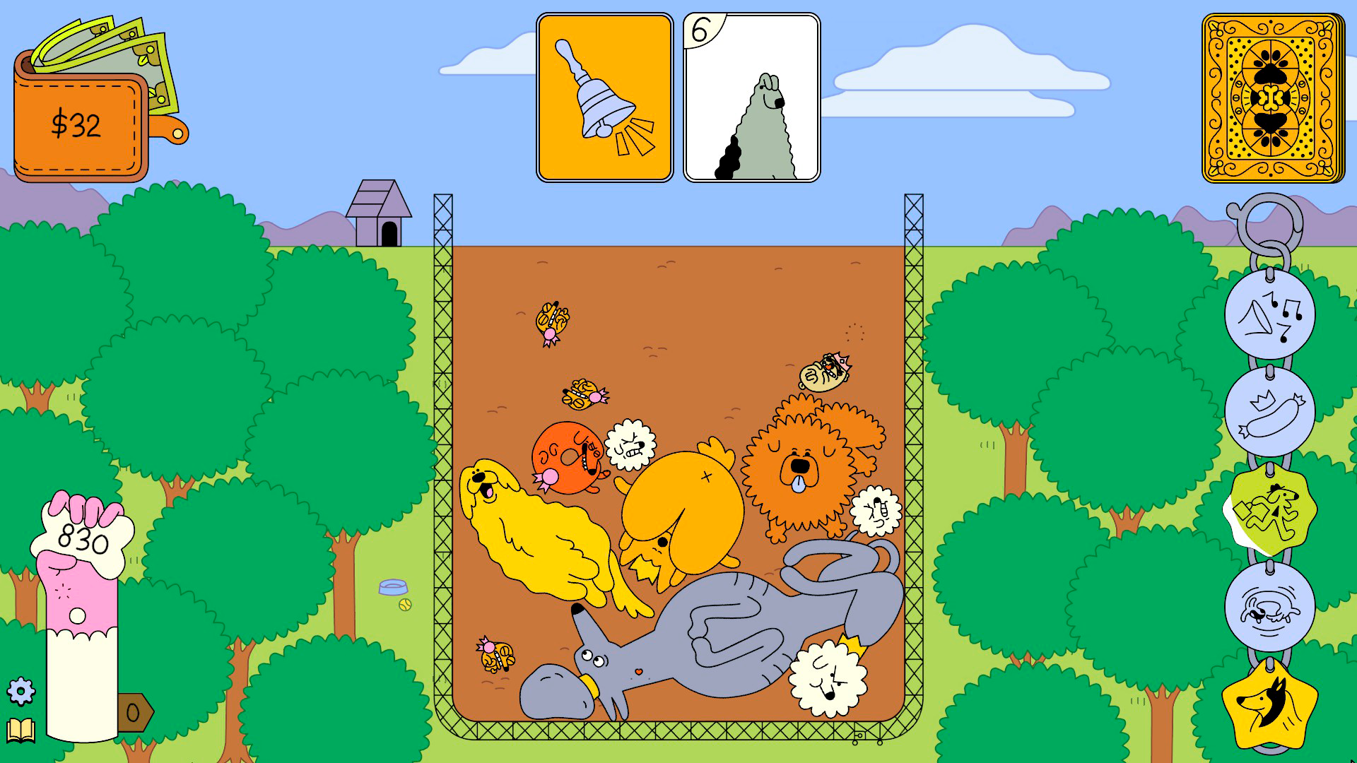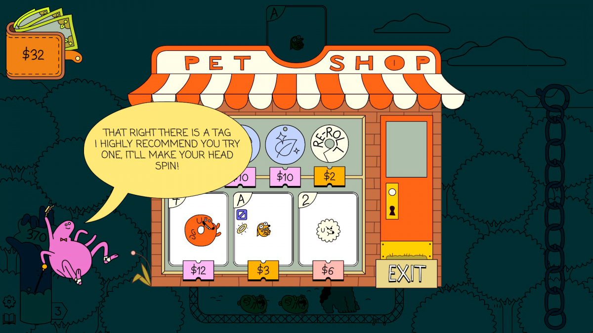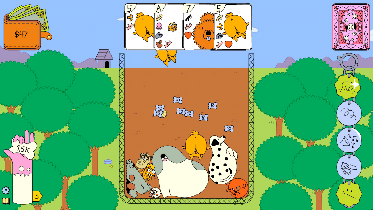 Este movimiento nos puede beneficiar, pero también abre la puerta al descontrol, al caos, al desorden, algo que en muchas ocasiones nos permitirá alargar la partida un poco más y, quizá, estar ante una run exitosa. En nuestra mano está la introducción de estas variables en la partida, ya que cada vez que acabemos una ronda y pasemos por la tienda podremos mejorar tanto nuestro mazo, comprando distintos tipos de cartas, como adquirir una serie de etiquetas que condicionarán nuestras acciones. Estas tags —con ese nombre aparecen en el juego, que tristemente no está traducido al castellano— se fijan en un collar que aparece en la parte inferior derecha de la pantalla, un espacio en el que podremos acumular varias, pero también venderlas —por la mitad de su valor original— y así hacer hueco a otras. Hay cuatro tipos de etiquetas en función de su rareza, lo que condiciona tanto su probabilidad de aparecer como su precio, y según avanzamos en el juego resulta más sencillo descubrir sinergias entre ellas; las hay que permiten que los ases sean más grandes y se fusionen con los doses, ideal si tienes una que aumente la bonificación al fusionar cartas pequeñas, otra permite anular la gravedad y facilita así acceder a los perros que estaban ya sedimentados en el fondo del parque, hay una que evita el primer game over, otra que hace que los perros de un tipo concreto ladren… ¡muchas posibilidades!