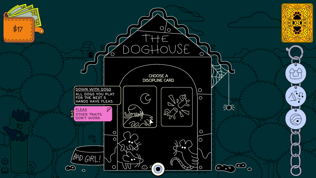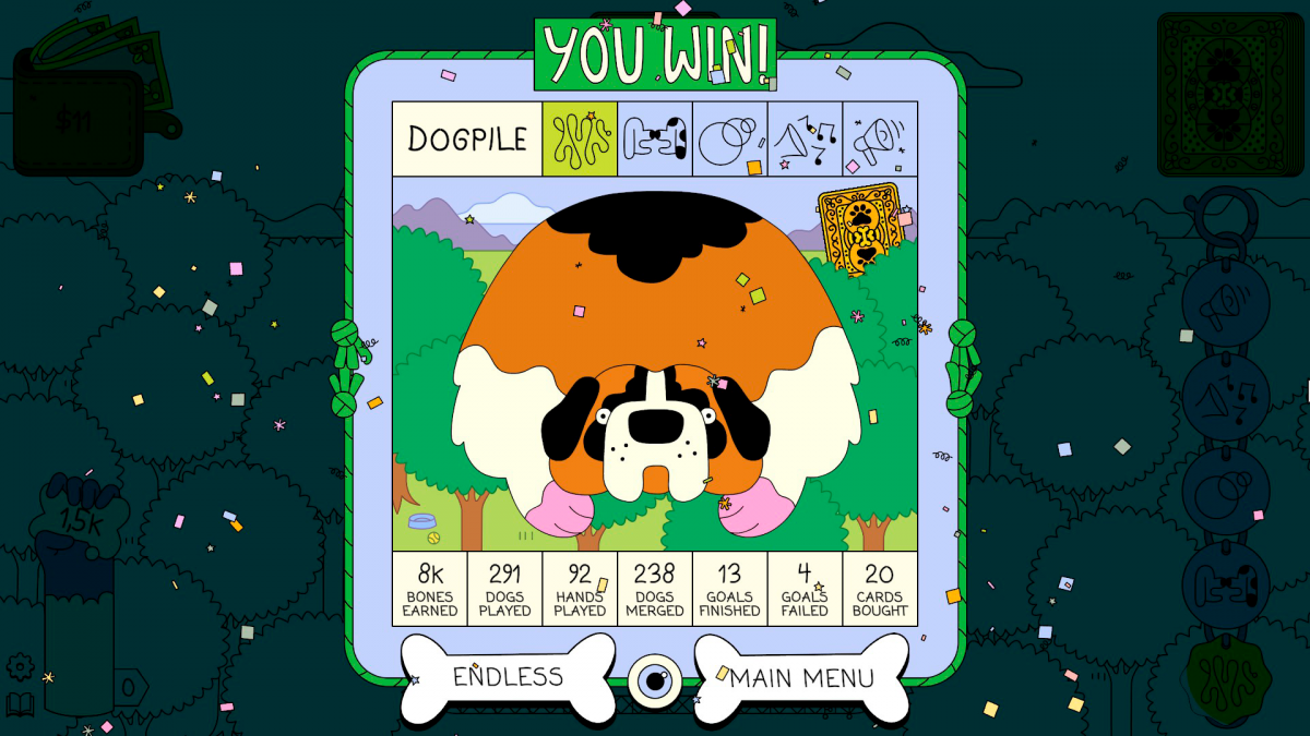 El último elemento a tener en cuenta son las tarjetas de castigo. Tendremos que elegir entre dos cada vez que no cumplamos un objetivo y suelen ser un palo en la rueda que nos precipita hacia la derrota. Hay diecinueve tipos y van desde introducir una roca en mitad del parque hasta aumentar el tamaño de varios perros o volverlos incapaces de fusionarse durante varias manos. Por suerte, todo elemento de Dogpile tiene su contraparte para que volvamos a tomar las riendas de la partida; si una roca nos estropea la estrategia y hace que el nivel freático-perruno suba y las fusiones resulten imposibles, igual encontramos en la tienda una etiqueta que haga que los ladridos rompan rocas, que además se combina de lujo con la que nos hace ganar más huesos cuando ciertos perros escuchan un ladrido. Las posibilidades no son infinitas, pero son las suficientes como para que cada partida resulte interesante y poco repetitiva.