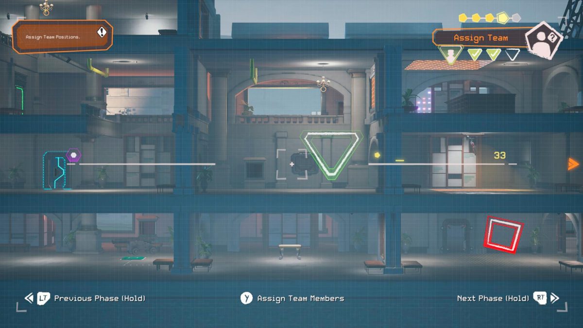 Una vez Nomali llegue a su destino podremos analizar a vista de dron todo el escenario para conocer así dónde está el objetivo, qué tipo de medidas de seguridad se interpondrán en nuestro camino y qué serie de obstáculos tendremos que superar para poder salir de allí. Al principio resulta bastante intuitivo, pero según avanza el juego podremos elegir entre varias rutas, distintos puntos de acceso y salida, pero sobre todo aquellos puntos donde queremos que nuestros aliados intervengan para echarnos un cable; algo en ocasiones literal, ya que nuestro equipo cuenta con un acróbata capaz de ayudarnos a ganar impulso o a llegar a zonas alejadas gracias a una suerte de tirolina, todo un ninja el bueno de Ndedi. En el modo más sencillo no existe limitación alguna, por eso es recomendable jugar en la dificultad por defecto —o en la más difícil quien quiera un reto mayor— para que la experiencia sea tensa y emocionante.