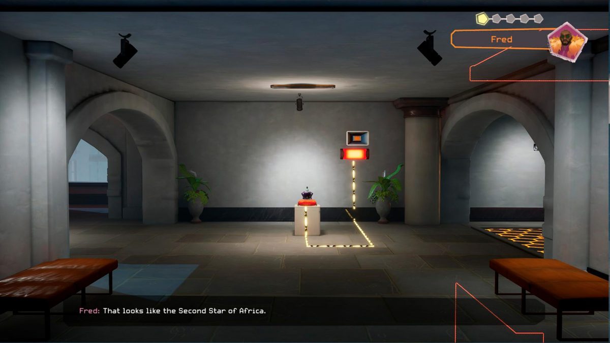 Giros argumentales al margen —que los tiene, no todo es un sencillo paseo en línea recta para Nomali y los suyos—, la estructura de cada misión en Relooted es similar: acudimos a la sala de reuniones en nuestra base secreta, un espacio donde también podremos charlar con el resto de personajes, entrenar en un simulador o repetir las misiones exitosas si queremos mejorar nuestro resultado, después regresaremos a este punto; los cerebros del equipo presentan cuál es el siguiente objetivo a recuperar, una parte que podemos saltarnos o, mucho más recomendable, disfrutar en su totalidad para conocer mejor las obras de arte reales que aparecen en el juego y su origen; ponemos rumbo a la localización donde tendrá lugar el atraco y comienza la diversión.