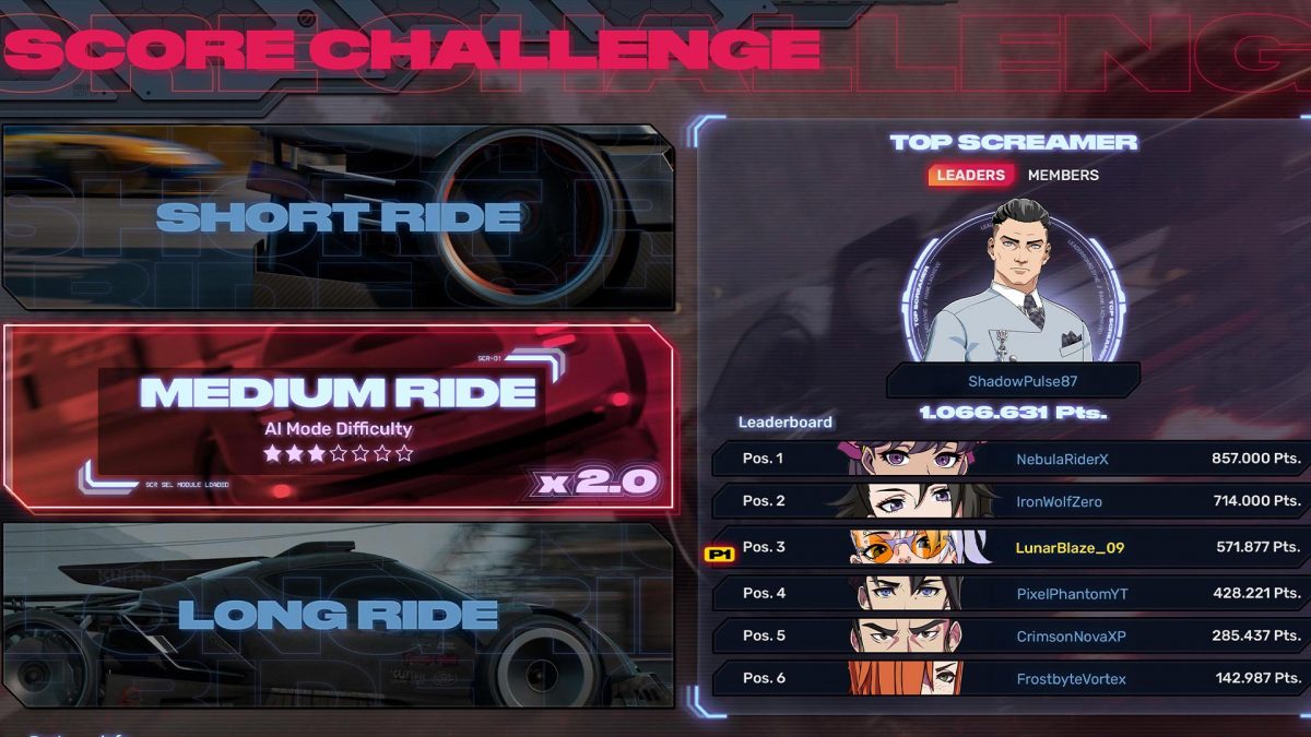 Quien sí opte por adentrarse en el torneo encontrará una historia larga. Este modo de Screamer está dividido en cuatro bloques, cada uno con un buen puñado de capítulos en los que, casi siempre, tendremos que superar una parte jugable con uno o varios objetivos: gana la carrera, ejecuta con éxito cierta técnica, logra realizar un número concreto de eliminaciones o derrapa durante una distancia determinada, por ejemplo. Screamer es de esos juegos en los que si te cuentan todo lo que puedes hacer quizá parezca demasiada información, un gameplay muy complejo, pero nada más lejos de la realidad. Presentado poco a poco, como sucede precisamente en este modo, las mecánicas se asimilan sin ningún problema y después desenvolverse con soltura en el arcade resulta natural.