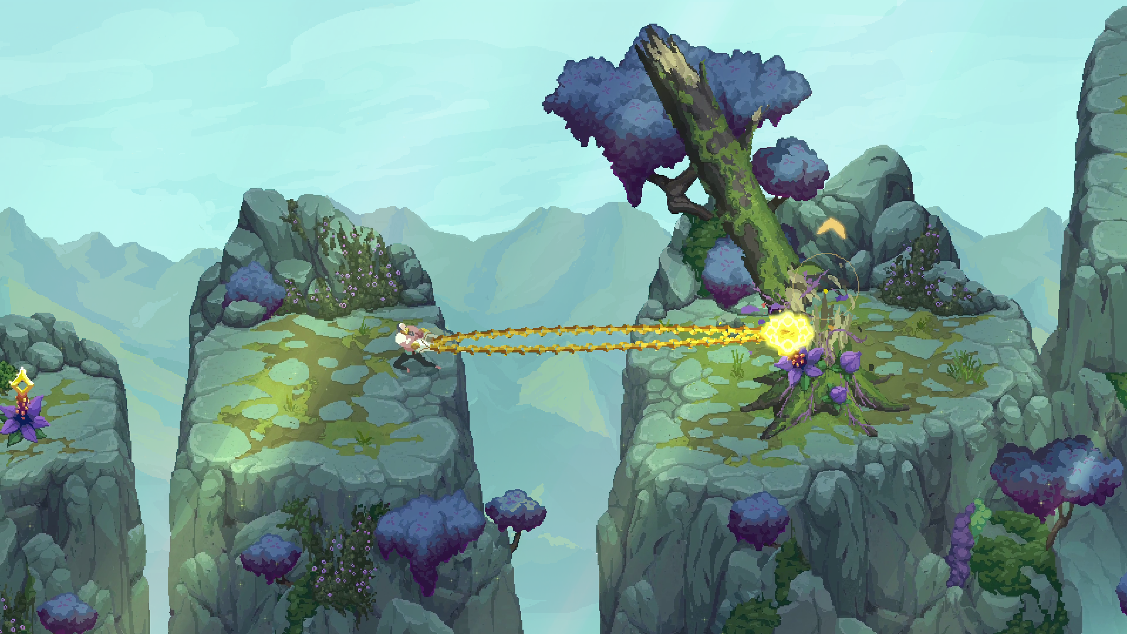 Ahí es donde más brilla esta capacidad de nuestro personaje, porque (siempre que nuestro enemigo sea capaz de usar magia) podremos robar los hechizos de los rivales conservando el elemento y el conjuro específico que utilizaban, con la única pega de que habrá que esperar un poco para volver a mangarle su encantamiento al mismo soldado. El mejor detalle, en cualquier caso (y más allá de que, al hacerlo, también les drenaremos un pelín la vida), es que los hechizos robados no nos costarán ni una gota de nuestro maná, así que es sencillo entrar en la estimulante dinámica de sus combates. Sus rápidos ataques físicos fluyen perfectamente con la tremenda agilidad que aporta su gancho, otra habilidad con usos ilimitados que nos dará una velocidad endiablada y que podremos utilizar con inteligencia y reflejos para destruir a todos nuestros enemigos mientras esquivamos sus ataques. Sumar todos estos ingredientes convierte a cada una de sus peleas en un ejercicio hipnótico, estudiado y enormemente gratificante que crece a medida que aprendemos a dominarlo, y cada una de las pantallas en las que encontramos nuevos grupos enemigos suponen casi un pequeño rompecabezas en el que tendremos que gestionar tanto nuestros hechizos como los de nuestros enemigos para aprovechar los daños elementales —tiene su propia tabla de tipos, aunque con solo tres pares de opuestos— y salir lo mejor parados posible. No obstante, esas situaciones a resolver acaban mostrando sus costuras más pronto de lo que esperaríamos, porque en ocasiones los enemigos que nos encontramos no son muy distintos a los que vimos un par de pantallas atrás, algo que nos aleja de la sensación de estímulo constante para llevarnos a la pesadumbre de lo rutinario.