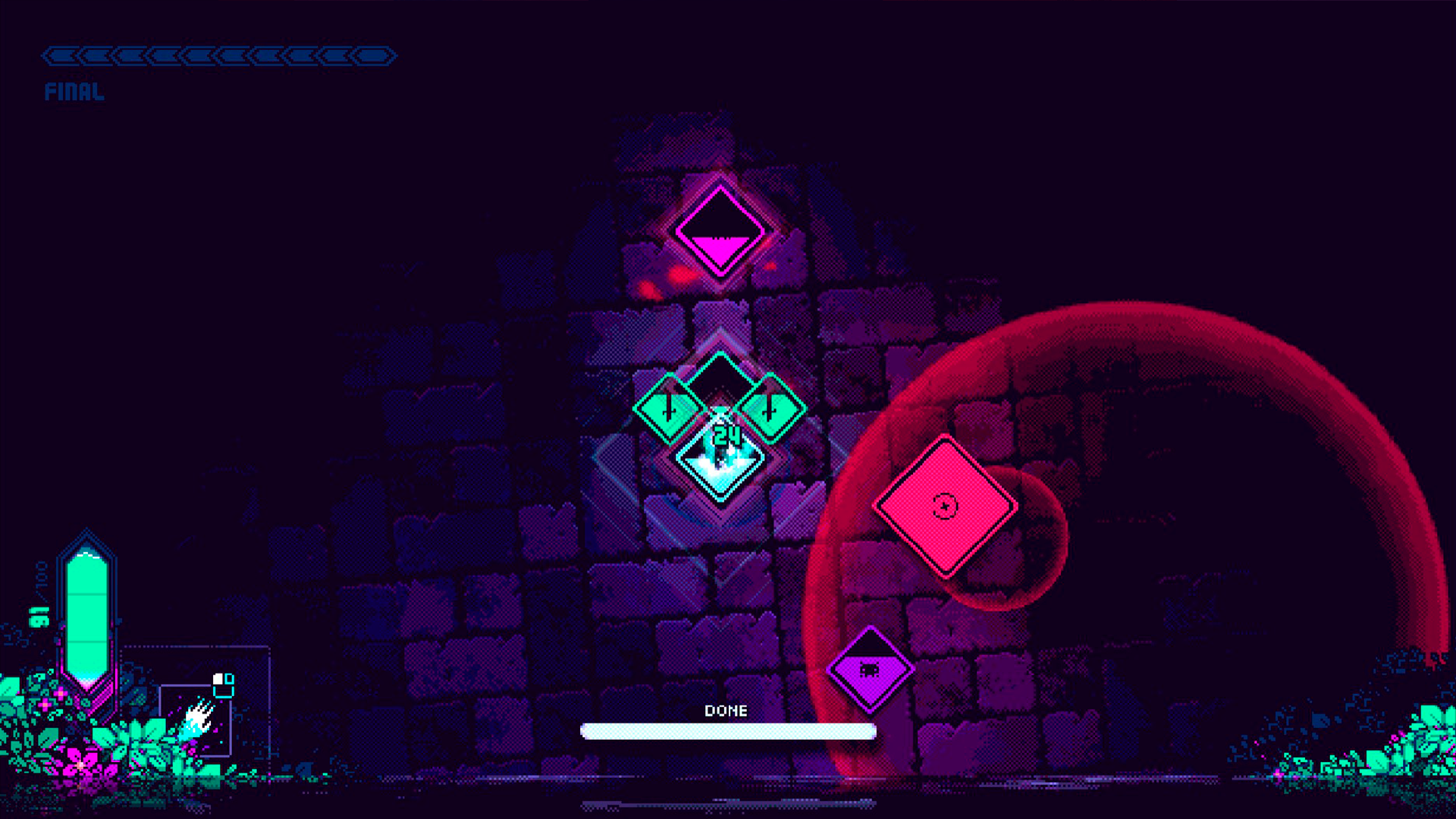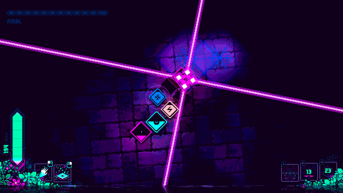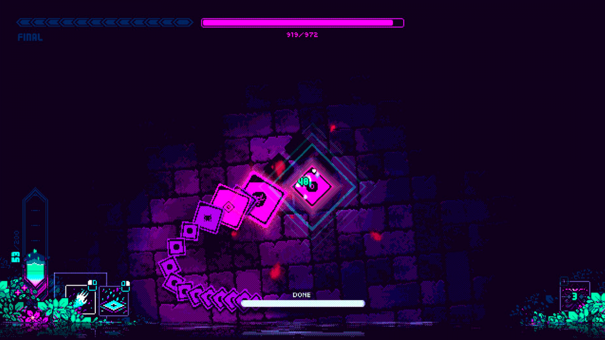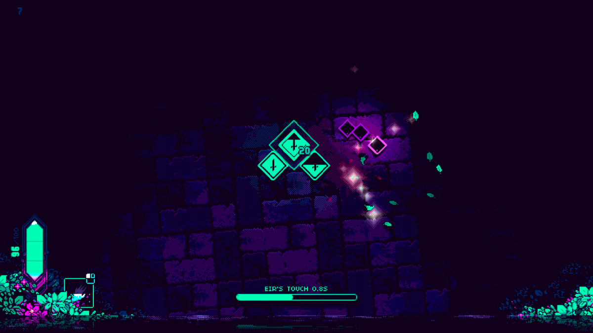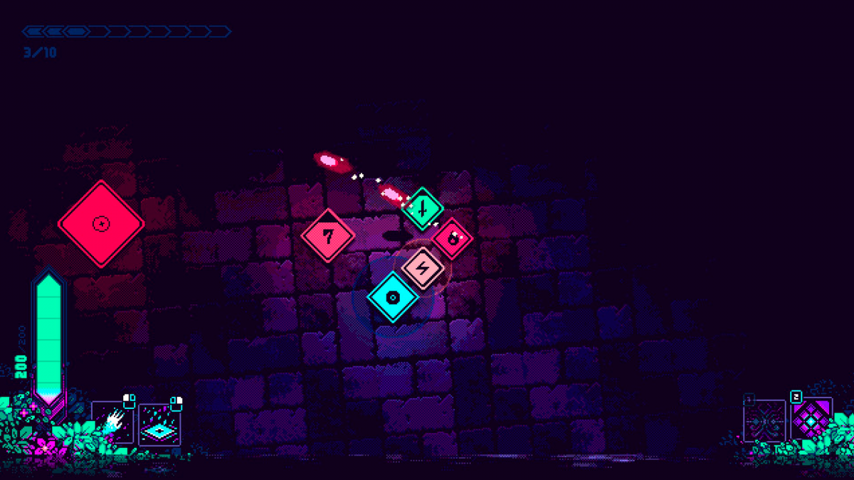 No es ninguna exageración hablar de Wild Growth en términos de juego de acción, ya que su núcleo jugable son los combates contra una serie de enemigos también representados por cuadrados de distinto tamaño y color a nuestros héroes; la legibilidad por suerte facilita la comprensión de lo que está sucediendo en todo momento, sobre todo gracias a la paleta de colores elegida. Suele ser habitual que nosotros seamos quienes ejercen la acción en estos juegos, pero aquí nos vemos forzados a tener un papel de apoyo —igual de importante, ¡incluso más de cara al éxito de esta misión!—. Sí podemos decidir dónde colocar a cada personaje dentro de la formación, un esquema que cuenta con más huecos que fichas totales podemos sumar al equipo una vez desbloqueemos todo el árbol de mejoras.