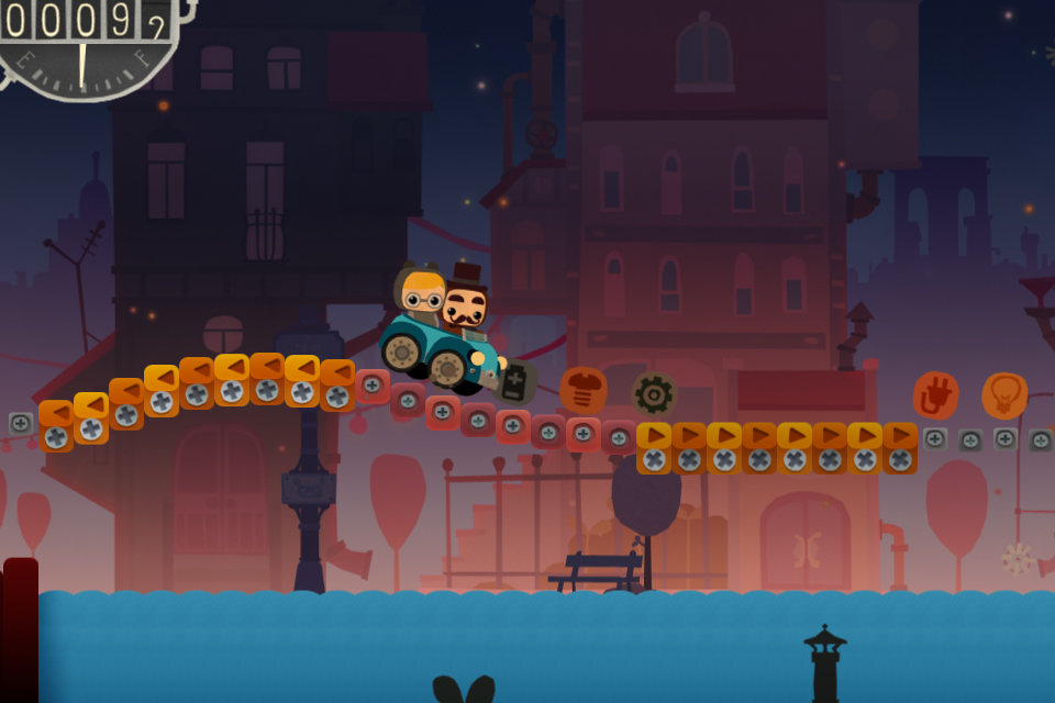 Supongo que al decirlo ahora suena más evidente que en 2011, pero la pantalla de créditos de Bumpy Road es absolutamente perfecta. Aquí son los dos desarrolladores suecos, no la pareja protagonista, los ocupantes de un cochecito azul que se mueve por la carretera y con la carretera: al tocar la pantalla táctil aparece un pequeño montículo detrás, delante o debajo del vehículo para que, cuestión de físicas, éste avance, retroceda o salte.