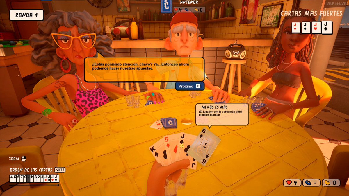 Parece que el multijugador estrella de este Steam Next Fest es el battle royale de mecanografía en el que cada tres errores en nuestra máquina de escribir implican que una bala se sume a la pistola de la inquietante figura que nos vigila junto a nuestra mesa. Demasiada tensión para mí, por lo que opté por este juego que nos lleva a un bar brasileño en el que echar una partida de cartas sin poner nuestra vida en juego. Antes de cada partida apostaremos con chapas cuántas rondas creemos que vamos a ganar, en cada turno los cuatro jugadores sacan una carta y la más alta, en función del orden de este juego concreto, será la ganadora. Conviene tener en cuenta que dos cartas iguales se anulan, que hay varias cartas especiales y que la carta elegida como la mejor para esa partida dependerá del palo a la hora de dirimir cuál se impone. Sin duda es un entorno más agradable en el que pasar la tarde.