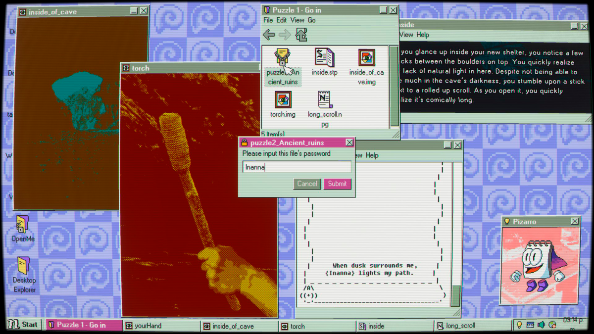 La interfaz de PC de hace un cuarto de siglo nos traslada automáticamente a finales del siglo XX, justo cuando la protagonista del juego accede a esta, por aquel entonces, moderna computadora. Tendremos que encontrar la contraseña para resolver cada capítulo de la aventura; al principio es tan sencillo como localizar la palabra entre corchetes en un archivo, pero según avancemos nos tocará alterar la forma de la ventana emergente, buscar en alguna carpeta oculta y un buen puñado de ideas tan curiosas como lógicas dado el ecosistema en el que operamos. Contaremos con el apoyo de una mascota virtual poco intrusiva, ¡aprende, Clippy!