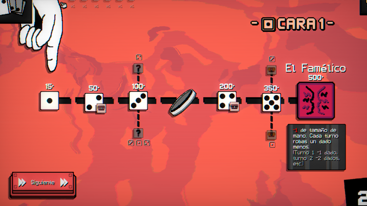 «El juego consiste en lanzar dados», o algo así decía un sabio. Podremos tirar hasta cinco dados y así conseguir una serie de puntos para superar cada ronda, los puntos sobrantes una vez terminen las tiradas y paguemos lo que debemos nos servirán para ampliar los dados de nuestra bolsa y aumentar nuestras opciones en las rondas venideras. Influye el número del dado, pero también la posición en la que termina y los distintos efectos tanto de los dados como de ciertas cartas que podemos activar antes de la tirada o de los hasta diez anillos que podemos llevar en la mano lanzadora. Si decimos que es un Balatrolike con dados resulta sencillo imaginar qué tipo de juego es, en el mejor de los sentidos. A poco que consiga invitarnos a jugar solo una partida más puede convertirse en una propuesta interesante.