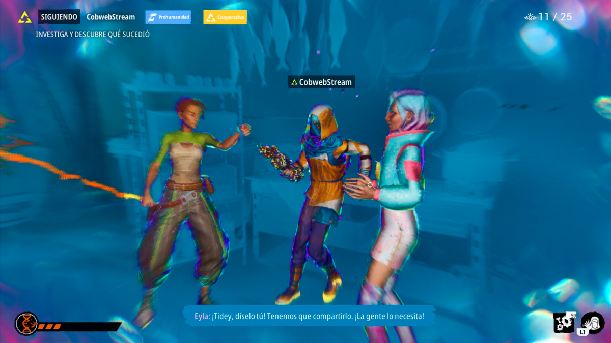 Los creadores de Road 96 anunciaron hace meses esta aventura asíncrona en la que las acciones de otros jugadores condicionarán nuestra experiencia, de la misma forma que nuestras acciones afectarán a… aquellos que vendrás después. Un juego en primera persona en el que rapiñar recursos, elegir opciones de diálogo, esquivar guardias y observar qué hizo un jugador previo —existen dos tipos de «Mareas del Tiempo» a observar, las doradas son relevantes para el progreso y las moradas muestran ciertas acciones del jugador previo«». En nuestro caso nos encontramos con un lugar hostil y pocos recursos, pero las decisiones que tomamos generaron que quien nos siga encontrará una base abierta y sencilla de recorrer, además de un botín inicial bastante apetecible. Es una mecánica interesante que puede ramificar cada misión de formas interesantes, sobre todo si consiguen que se integre con la historia. ¿El objetivo final? Erradicar una enfermedad que por ahora solo podemos aplacar temporalmente con una sustancia llamada ozen.