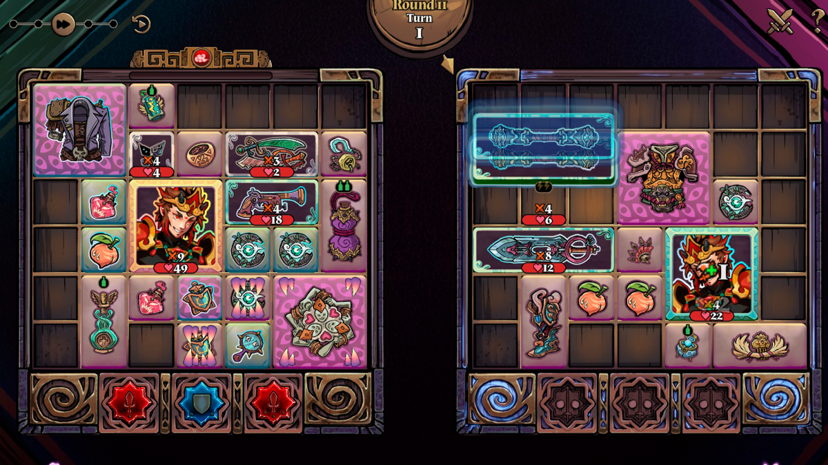 Hay cierta atmósfera mística que tanto por paleta de colores como por temática encaja sin mayor problema. El juego, pese a lo complejo que puede parecer, resulta sencillo de entender gracias a un buen trabajo —algo sabe de esto Anisa Sanusi— a la hora de mostrar la información y las sinergias de las fichas de objetos, armas y demás elementos con las que rodearemos a nuestro héroe antes de la batalla. Cada run finalizará cuando venzamos diez combates o cuando perdamos las cinco llamas, perdiendo o… de otras formas.