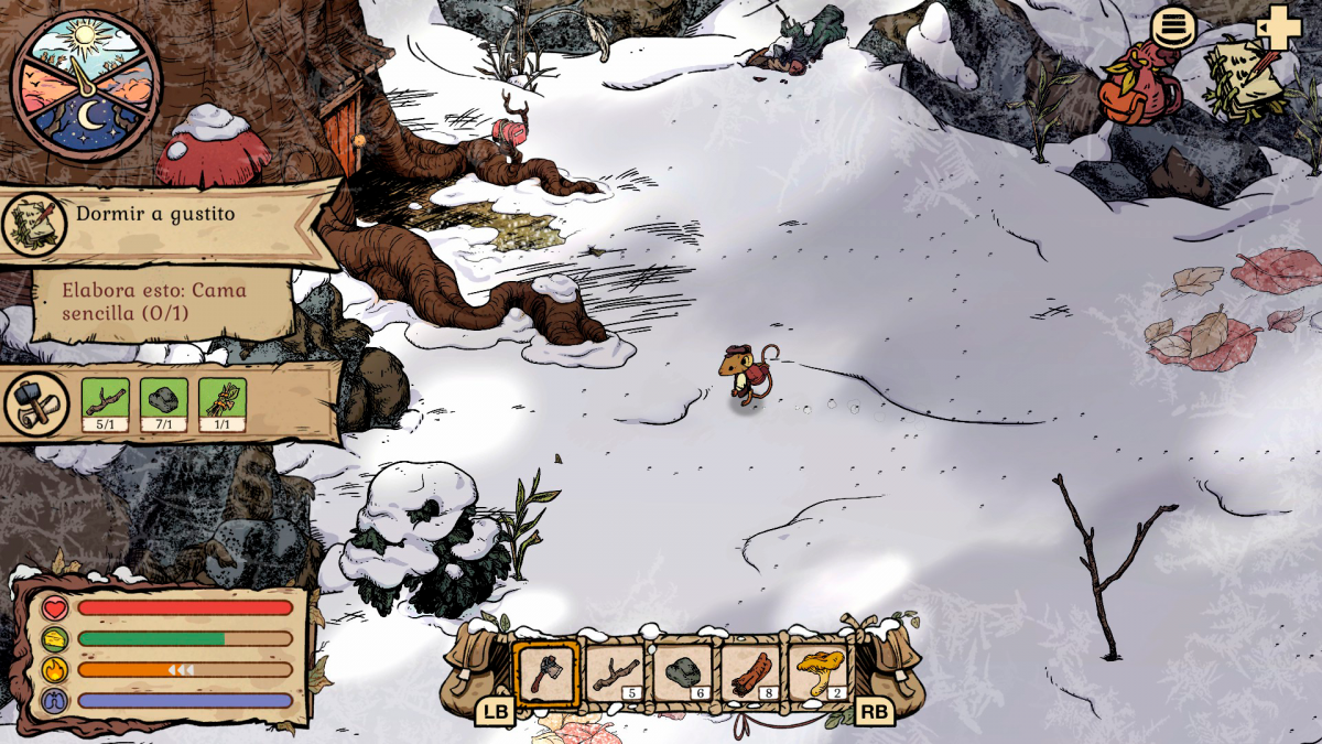 La secuencia inicial tiene la carga emocional suficiente como para querer acompañar a este simpático roedor en su regreso a la madriguera familiar que su familia abandonó para poner rumbo a la gran ciudad. Un juego de supervivencia en el que tendremos que empezar por lo más básico: reparar nuestro hogar a base de recoger recursos y fabricar distintos objetos. Una vez encendamos un fuego podremos evitar que el frío nos atenace, hay insectos que eliminar para llenar nuestro estómago, pasar mucho tiempo fuera —sobre la nieve donde se marcan nuestras patitas— puede congelarlo todo y las acciones como talar setas o ramas provocarán que se vacíen nuestros pulmones hasta que nos demos un respiro. Parece más que listo para publicarse dentro de menos de un mes.