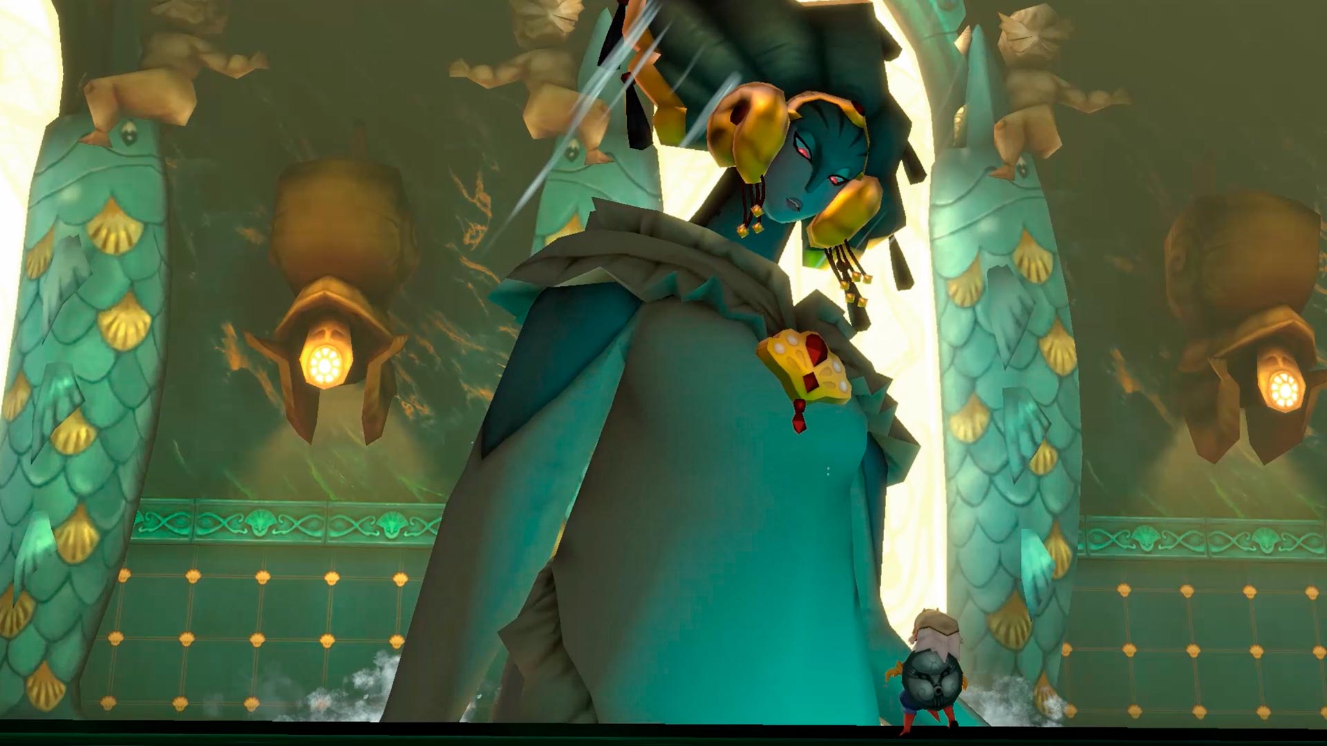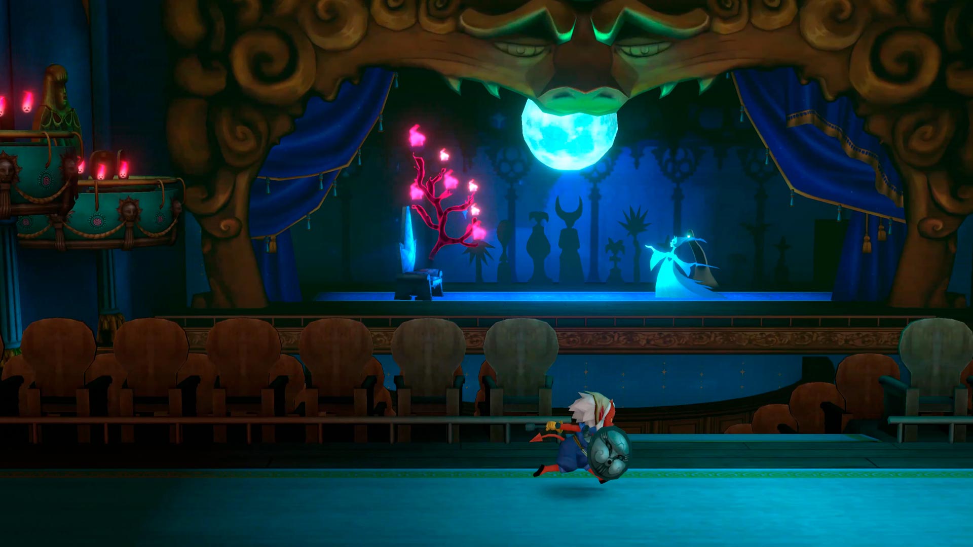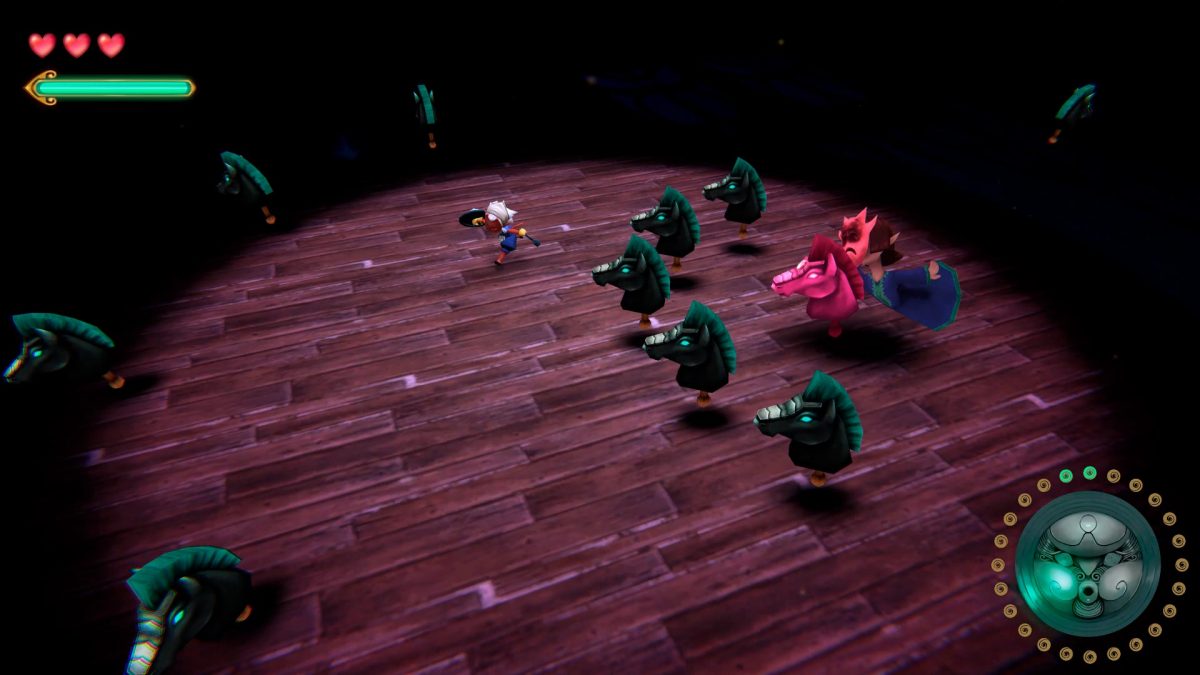 G Tiene que ver con una tercera referencia que es bastante importante, pero no la mencionamos lo suficiente: Luigi’s Mansion. La aspiradora de Luigi’s Mansion es una herramienta que interacciona con todo. De alguna manera el escenario siempre está comprendido para que la aspiradora haga algo. Creo que en el caso de Bel es parecido. Bel tiene un set de movimientos muy sencillos: Toca el gong, lo puede tocar con distintos ritmos y distinta potencia, pero también puede usar el escudo para bloquear en cualquier dirección y puede embestir. Por lo que el escenario está preparado para reaccionar a ese set de movimientos. Es el lenguaje con el que Bel se expresa.