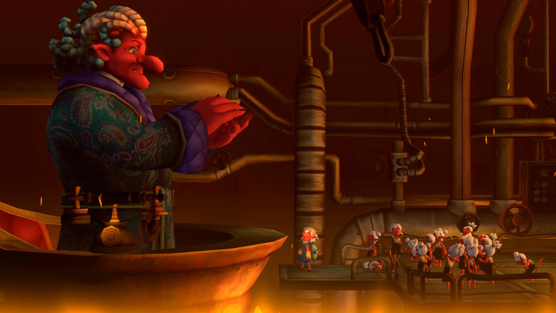 G Es un juego complejo, tiene un lore denso. En este mundo existe una sustancia que se llama aura. Solo se sabe que se produce cuando un ser mágico sufre un trauma espiritual y que se manifiesta en forma de llamas. Si se deja descontrolada, se expande y contamina las estancias a su alrededor y también a la gente. También existen demonios que no solo son inmunes al aura, sino que se la comen; para ellos es como un caramelo. Esta relación con el aura hace que los demonios sean una especie poco comprendida y un poco discriminada en el mundo mágico. Aparte, solo hay un sitio en el que uno puede curarse si se contamina con aura: este barco que está cruzando el mar de Mara. Es un barco colosal, con un montón de instalaciones. La energía que se necesita para activarlas y para mover el barco proviene de las calderas y en las calderas hay un demonio que es el que está proporcionando esa energía, pero no lo hace a gusto, sino que lo hace porque está aprisionado por un encantamiento. Ese es tu padre; se llama Belceboo.